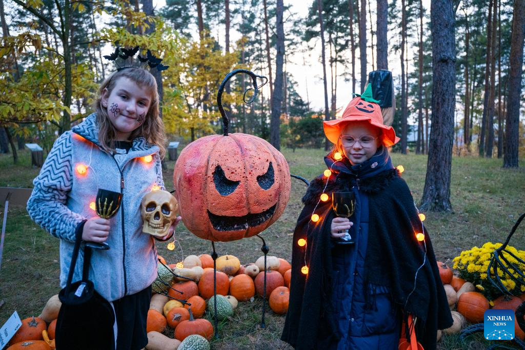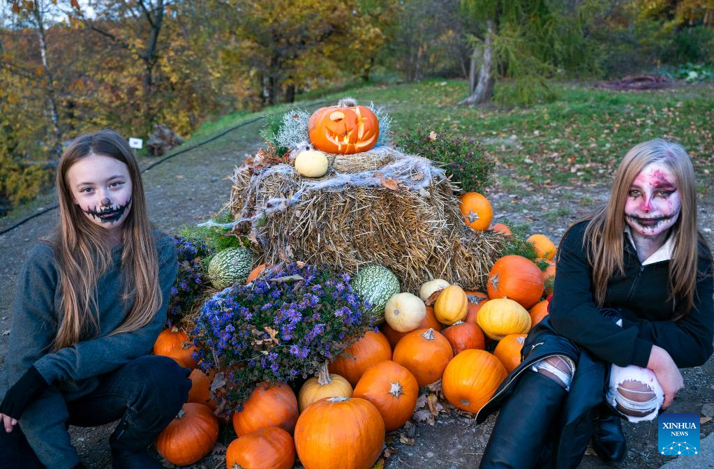 Girls pose for a photograph in front of a Halloween display at a botanical garden in Prague, the Czech Republic, Oct. 31, 2025. People enjoyed plenty of fun and games at the botanical garden during the Halloween Festival celebrations. (Photo by Dana Kesnerova/Xinhua)