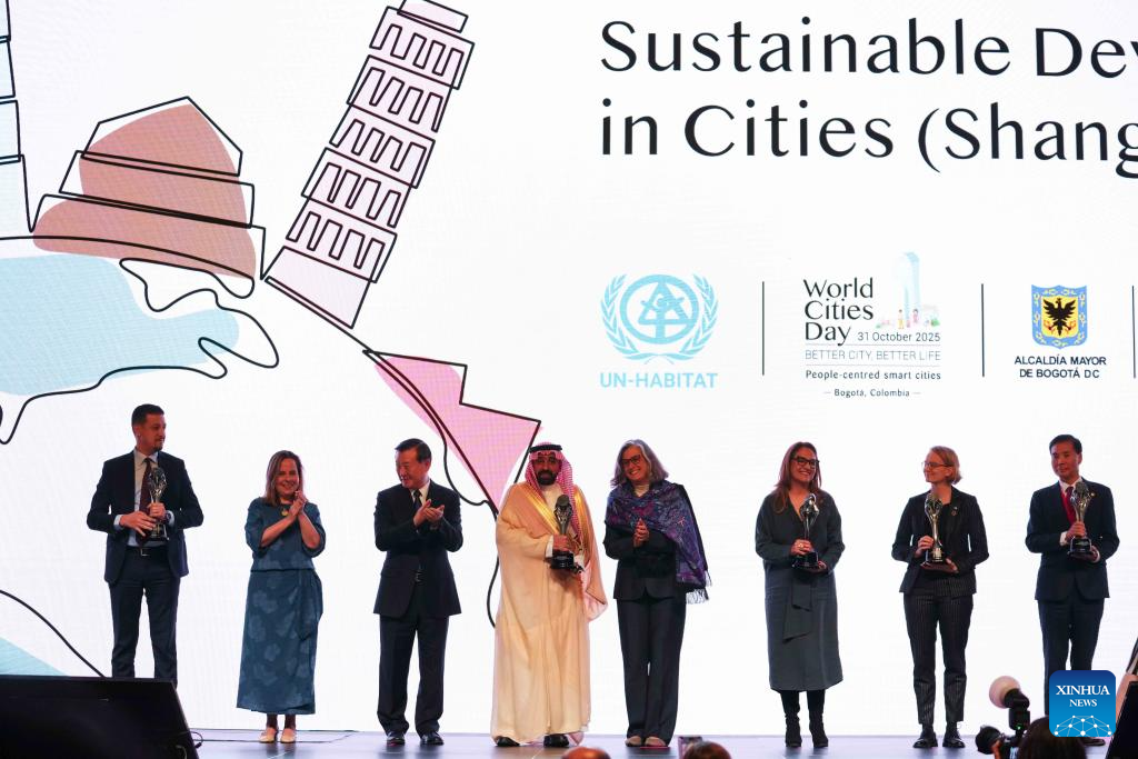 This photo taken on Oct. 31, 2025 shows the award ceremony of the 3rd Global Award for Sustainable Development in Cities in Bogota, Colombia. The Global Observance of World Cities Day 2025 was marked here on Friday in Colombia's capital under the theme "People-Centered Smart Cities." The event was held alongside the award ceremony for the 3rd Global Award for Sustainable Development in Cities, also known as the Shanghai Award. (Photo by Andres Moreno/Xinhua)