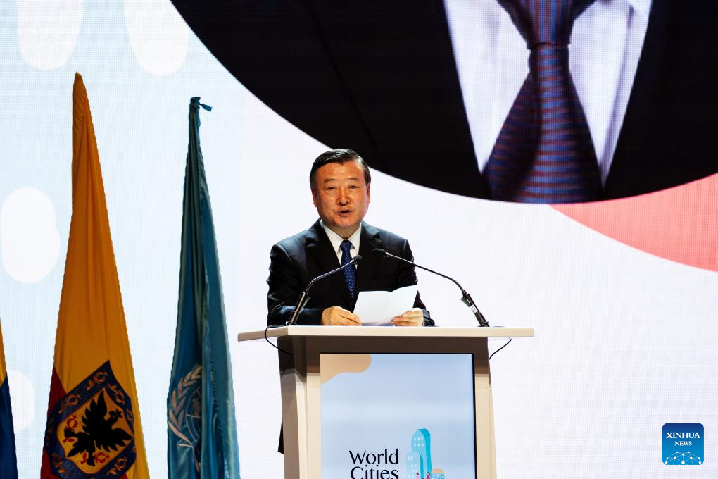 China's Minister of Housing and Urban-Rural Development Ni Hong addresses an event to mark the Global Observance of World Cities Day in Bogota, Colombia, Oct. 31, 2025.