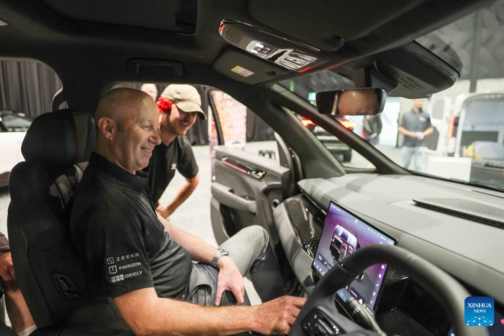 People experience a Chinese BYD vehicle at the Take Charge Expo in Christchurch, New Zealand, Nov. 1, 2025. The on-going expo showcases the latest in battery electric vehicles with Chinese brands drawing attention from international buyers. (Xinhua/Long Lei)