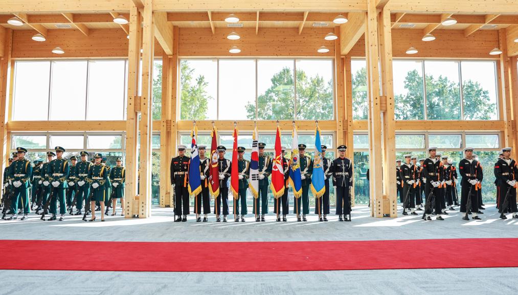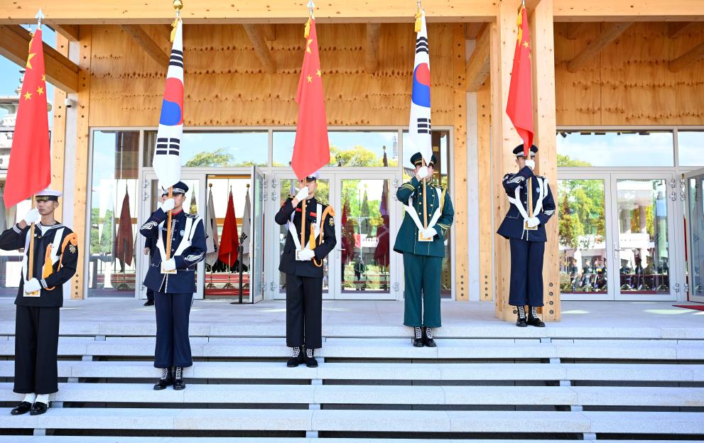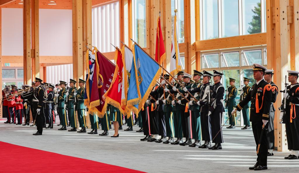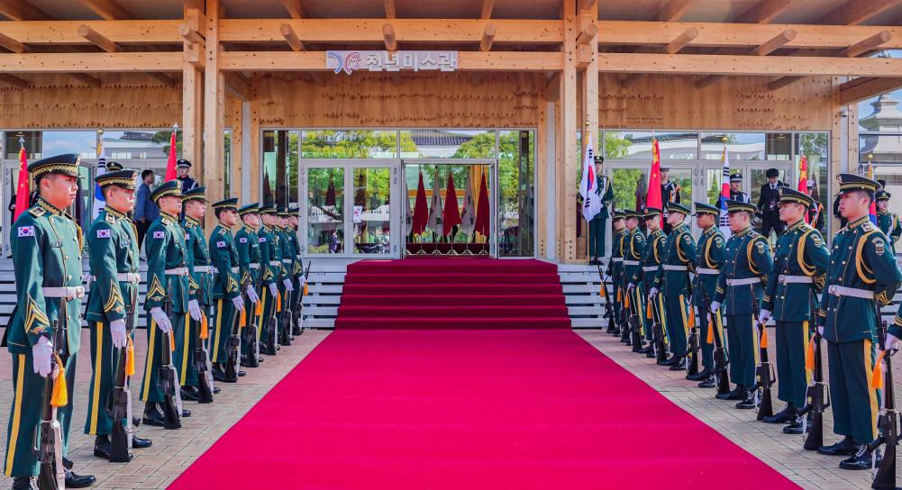 This photo taken on Nov. 1, 2025 shows a welcome ceremony held by South Korean President Lee Jae-myung for Chinese President Xi Jinping in Gyeongju, South Korea. (Xinhua/Yao Qilin)