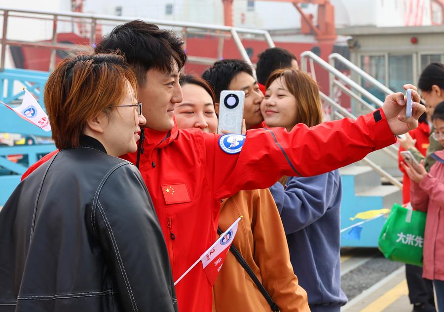 Members of the scientific expedition team bid farewell to their relatives, friends and colleagues on China's polar research icebreaker Xuelong, or Snow Dragon, in Shanghai, east China, Nov. 1, 2025. (Xinhua/Fang Zhe)