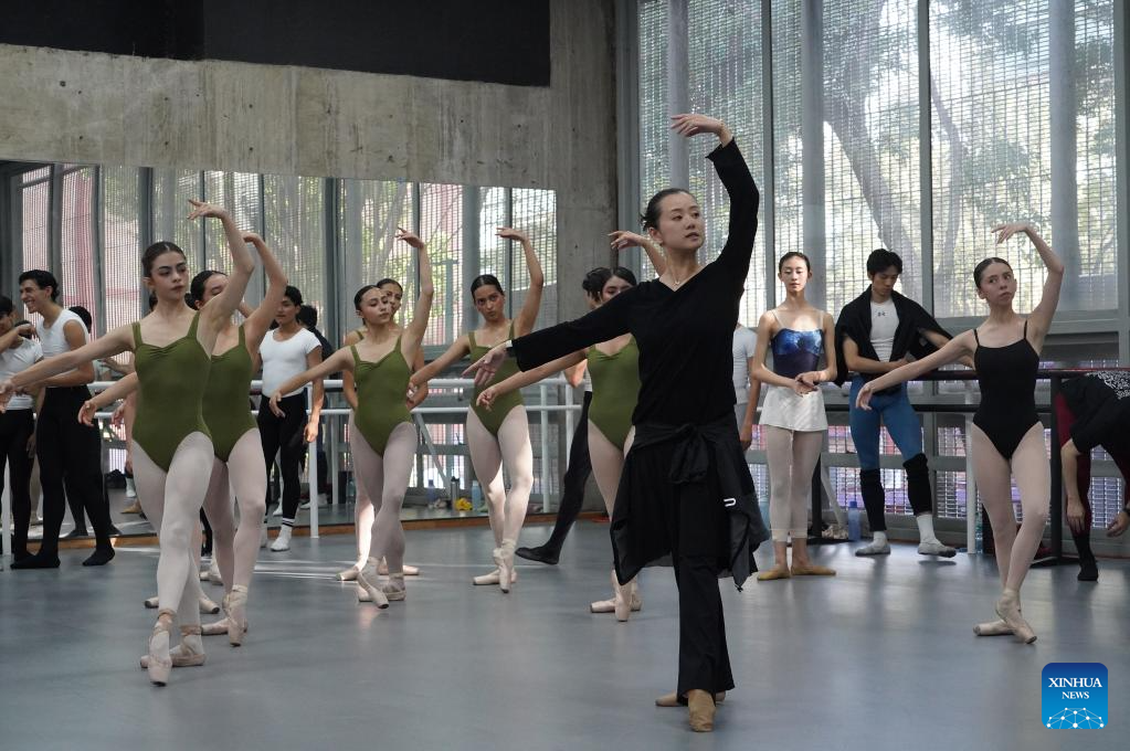 A teacher from the National Ballet of China teaches ballet to local students at the National Arts Center in Mexico City, Mexico, Oct. 31, 2025. On Friday, the National Ballet of China gave a masterclass to students of dance schools in Mexico City, and learned local dances of Mexico. (Xinhua/Li Mengxin)