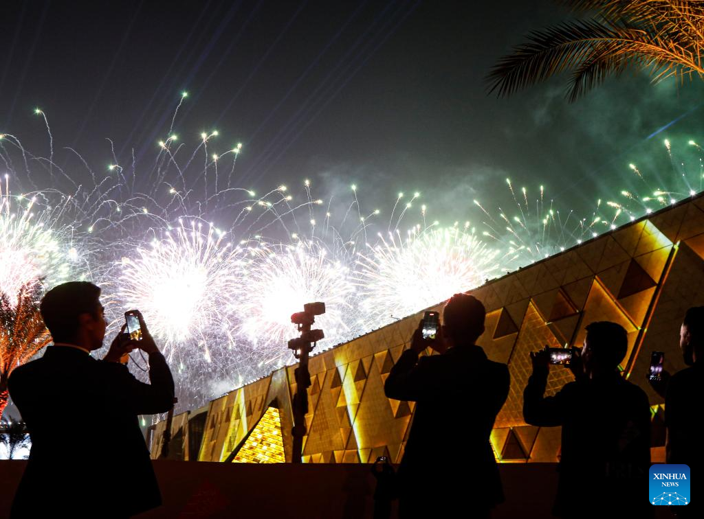 People capture images of a firework and light show during the inauguration of the Grand Egyptian Museum (GEM) in Giza, Egypt, Nov. 1, 2025. After two decades of construction, Egypt on Saturday inaugurated the GEM -- the world's largest museum dedicated to a single civilization -- during a grand ceremony held near the pyramids and the Sphinx, marking a landmark cultural event for the country renowned for its rich heritage. (Xinhua/Ahmed Gomaa)