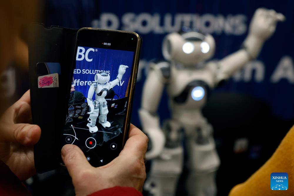 A visitor takes pictures of a humanoid robot during the 4th edition of the Robofest, a technology festival, at the Politehnica University of Bucharest in Bucharest, Romania, Nov. 1, 2025. The three-day festival including the 16th edition of the Robochallenge is held here from Oct. 31 to Nov. 2. (Photo by Cristian Cristel/Xinhua)