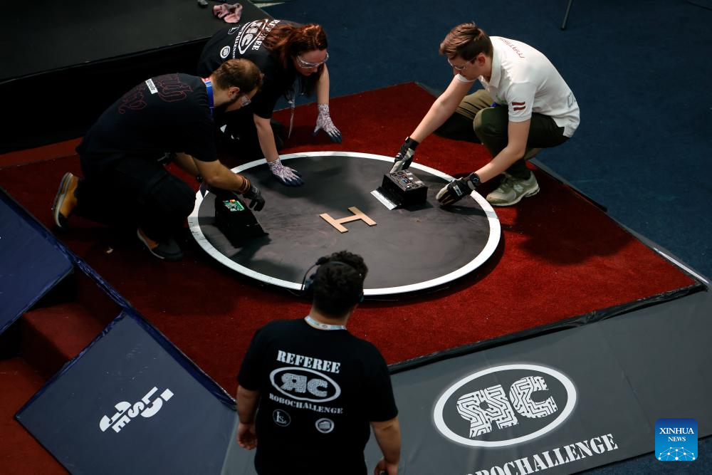 A participant prepares his robot for a contest during the 4th edition of the Robofest, a technology festival, at the Politehnica University of Bucharest in Bucharest, Romania, Nov. 1, 2025. The three-day festival including the 16th edition of the Robochallenge is held here from Oct. 31 to Nov. 2. (Photo by Cristian Cristel/Xinhua)