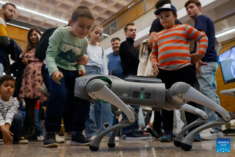 Children look at a robotic dog during the 4th edition of the Robofest, a technology festival, at the Politehnica University of Bucharest in Bucharest, Romania, Nov. 1, 2025. The three-day festival including the 16th edition of the Robochallenge is held here from Oct. 31 to Nov. 2. (Photo by Cristian Cristel/Xinhua)
