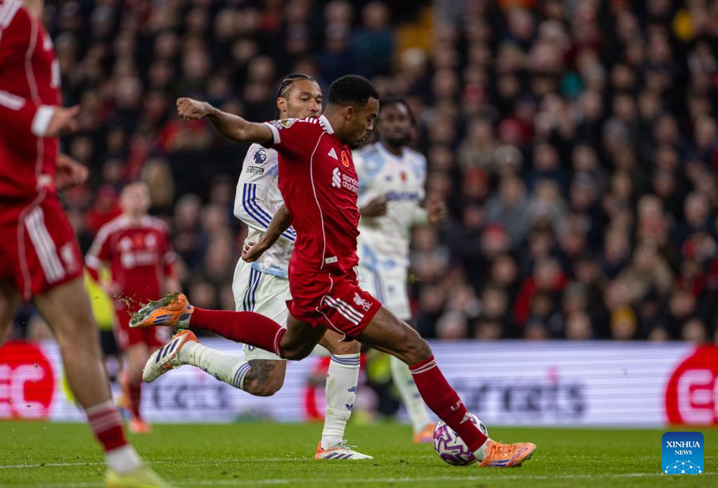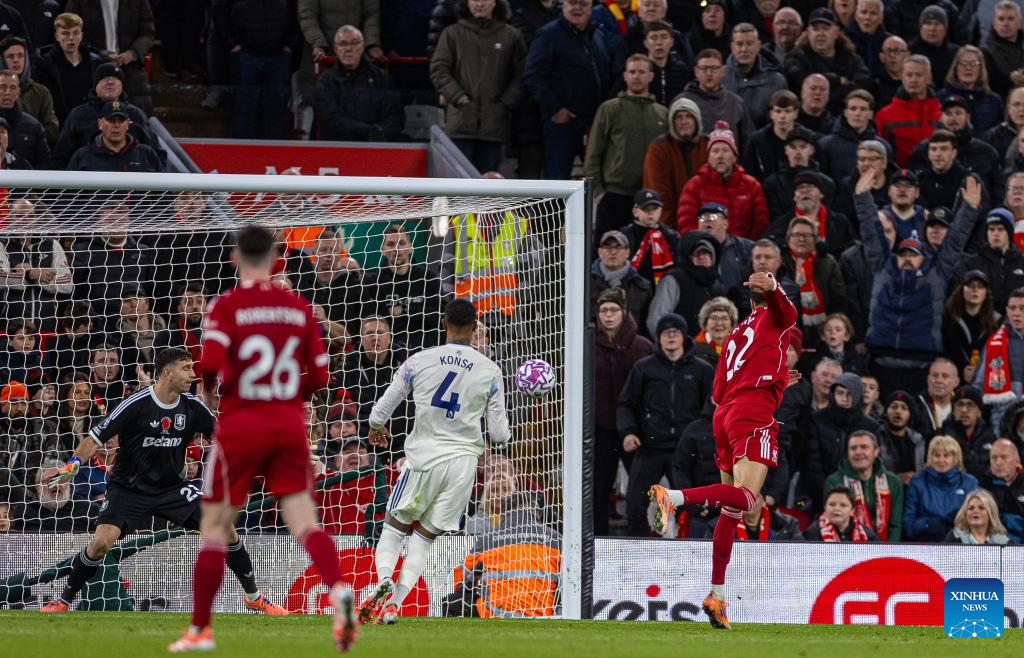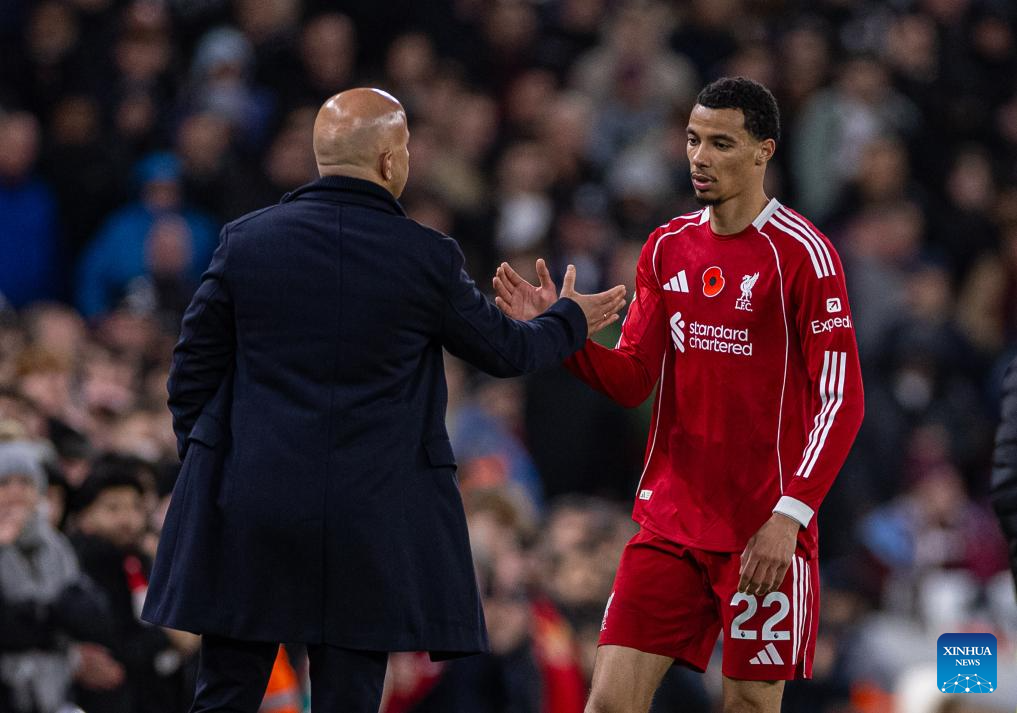 Liverpool's Ryan Gravenberch (front) scores the second goal during the English Premier League match between Liverpool FC and Aston Villa FC in Liverpool, Britain, on Nov. 1, 2025. (Xinhua)
