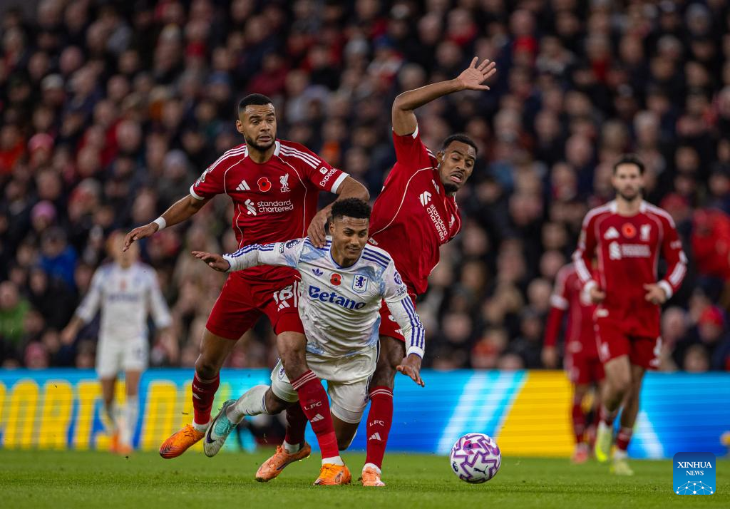 Aston Villa's Ollie Watkins is challenged by Liverpool's Cody Gakpo (L) and Ryan Gravenberch (R) during the English Premier League match between Liverpool FC and Aston Villa FC in Liverpool, Britain, on Nov. 1, 2025. (Xinhua)
