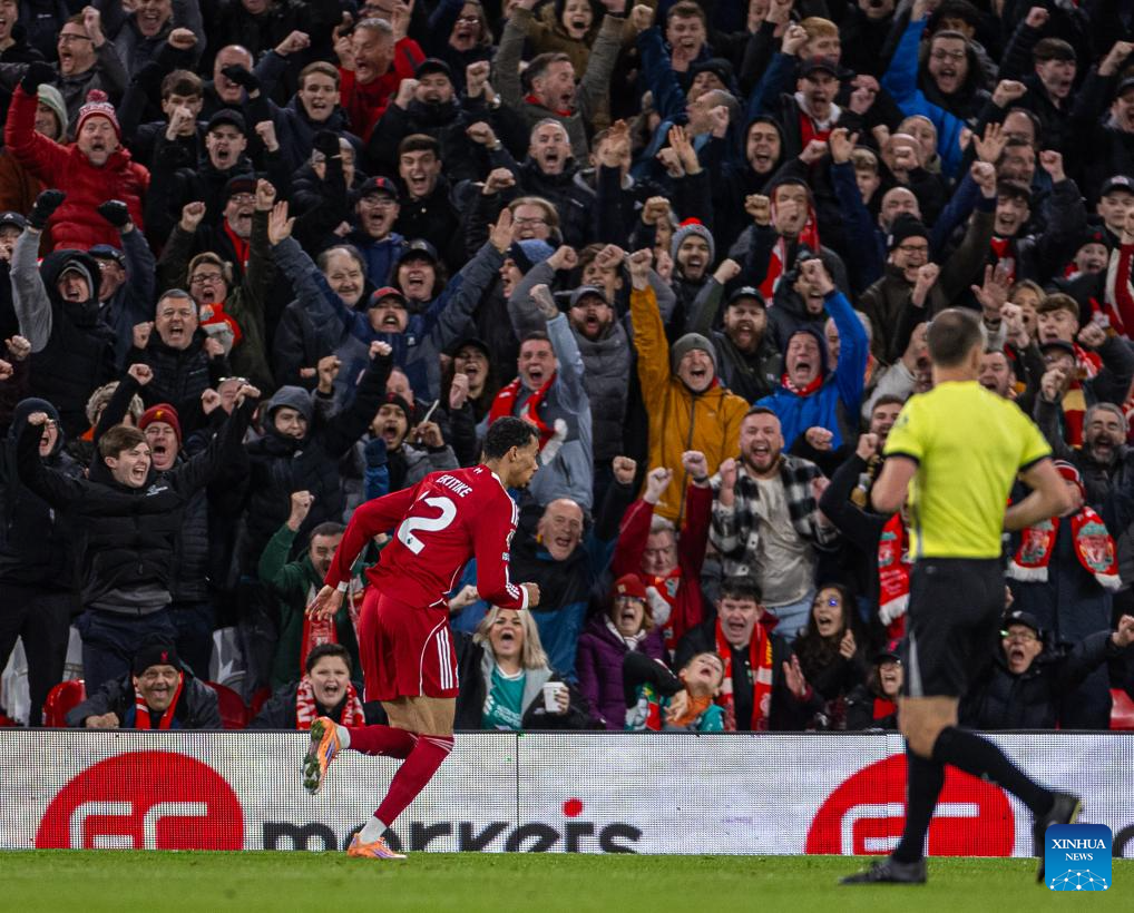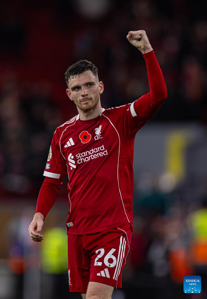 Liverpool's Andy Robertson celebrates after the English Premier League match between Liverpool FC and Aston Villa FC in Liverpool, Britain, on Nov. 1, 2025. (Xinhua)