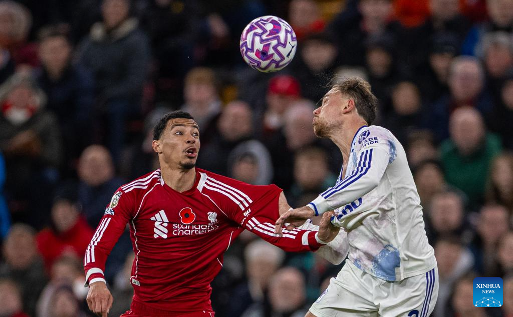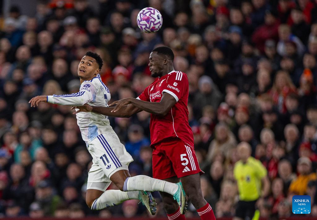 Liverpool's Hugo Ekitike (L) challenges for a header with Aston Villa's Matty Cash during the English Premier League match between Liverpool FC and Aston Villa FC in Liverpool, Britain, on Nov. 1, 2025. (Xinhua)