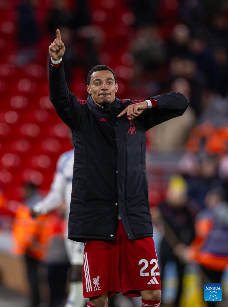 Liverpool's Ryan Gravenberch applauds the supporters after the English Premier League match between Liverpool FC and Aston Villa FC in Liverpool, Britain, on Nov. 1, 2025. (Xinhua)