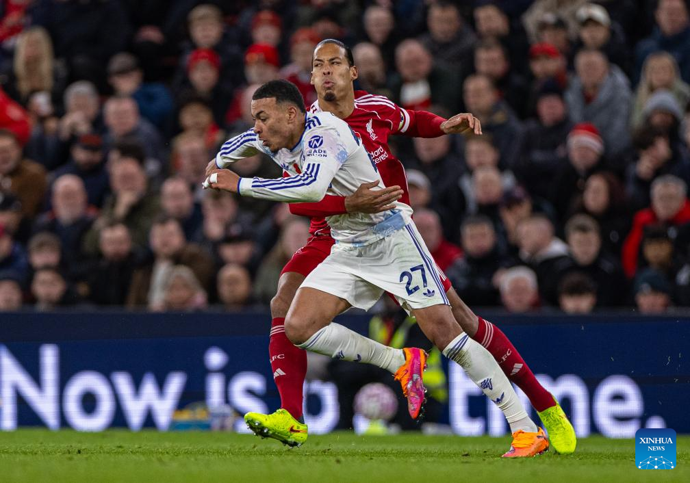 Liverpool's captain Virgil van Dijk (R) holds back Aston Villa's Morgan Rogers during the English Premier League match between Liverpool FC and Aston Villa FC in Liverpool, Britain, on Nov. 1, 2025. (Xinhua)