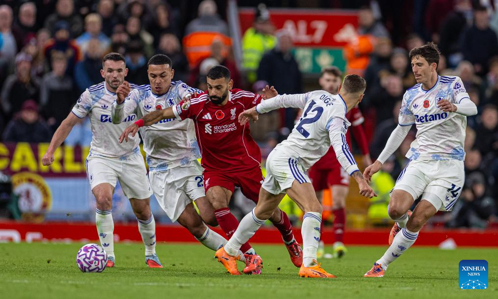 Liverpool's Mohamed Salah takes on four Aston Villa players during the English Premier League match between Liverpool FC and Aston Villa FC in Liverpool, Britain, on Nov. 1, 2025. (Xinhua)
