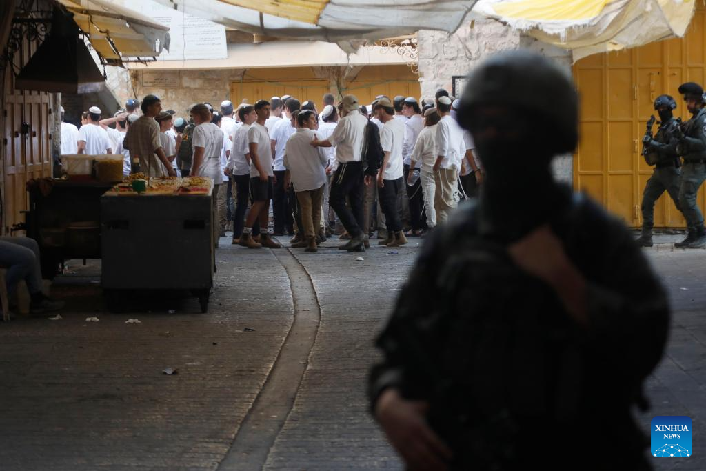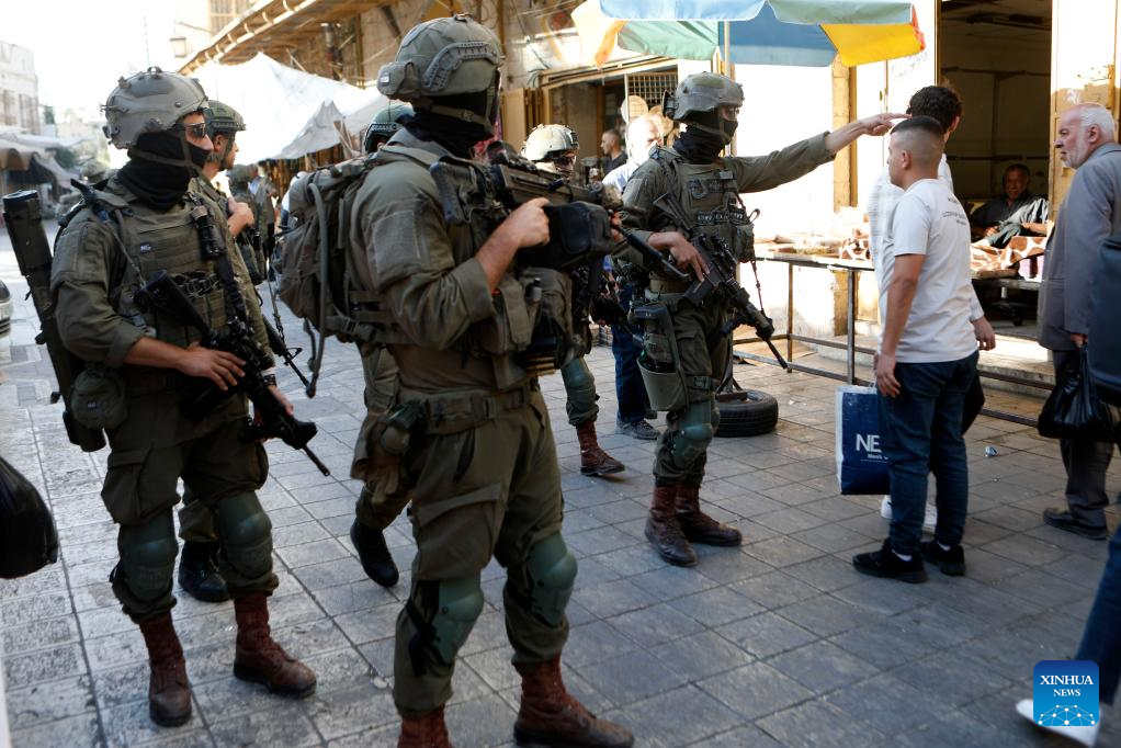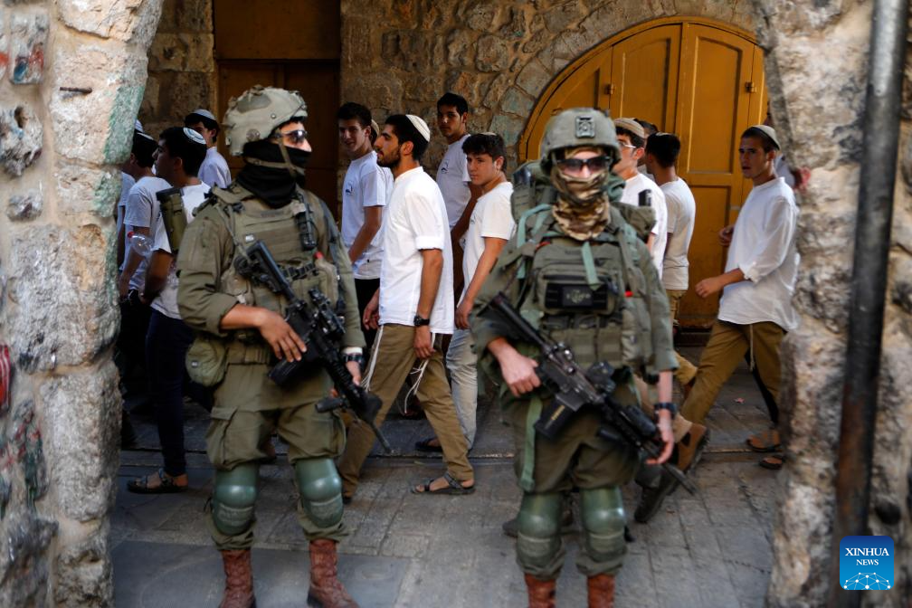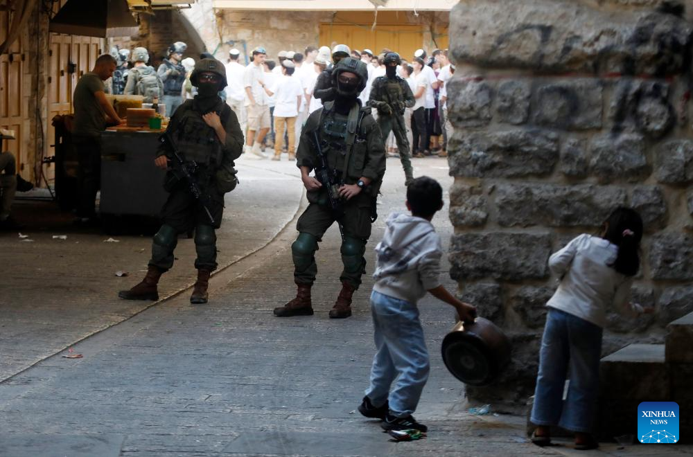 Members of Israeli forces secure the streets for Israeli settlers in the West Bank city of Hebron, Nov. 1, 2025. (Photo by Mamoun Wazwaz/Xinhua)