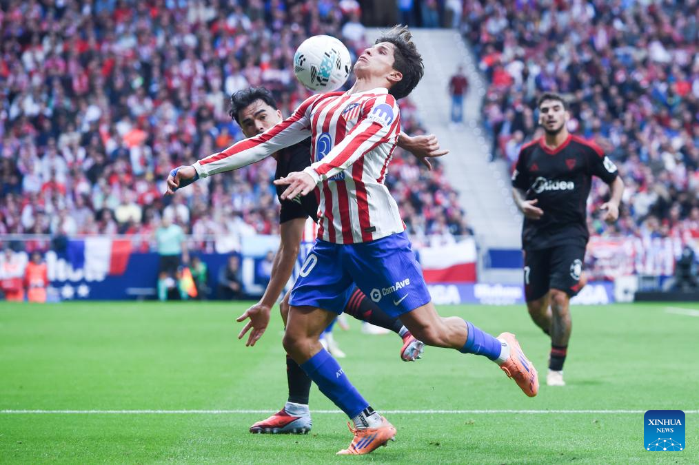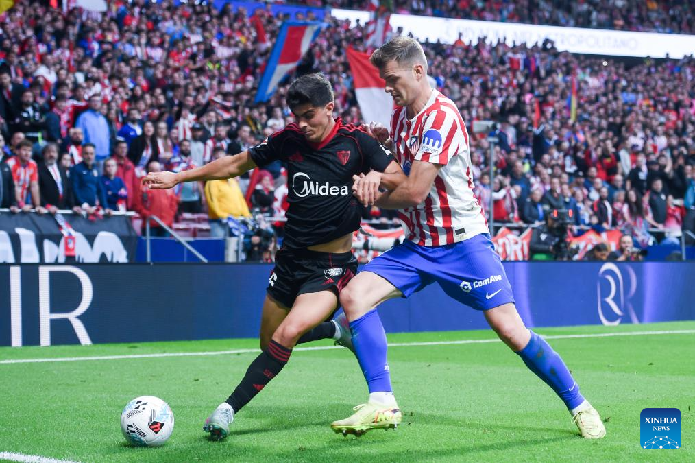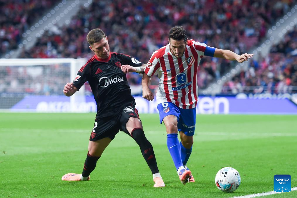 Koke (R) of Atletico de Madrid vies with Carmona of Sevilla FC during the La Liga football match between Atletico de Madrid and Sevilla FC, in Riyadh Air Metropolitano Stadium, Madrid, Spain, Nov. 1, 2025. (Photo by Gustavo Valiente/Xinhua)