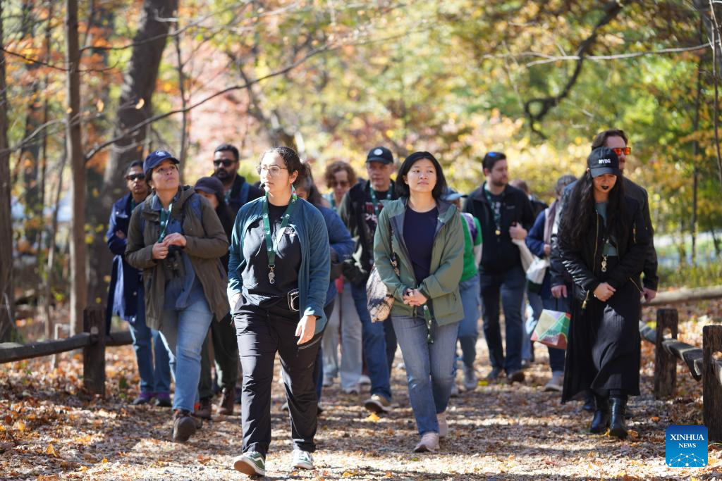 People walk in a forest with a tour guide at the New York Botanical Garden in New York, the United States, on Nov. 2, 2025.