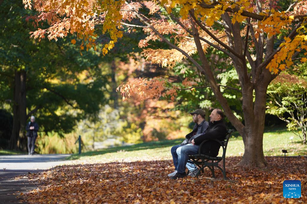 People enjoy the tranquil moment under a tree at the New York Botanical Garden in New York, the United States, on Nov. 2, 2025.