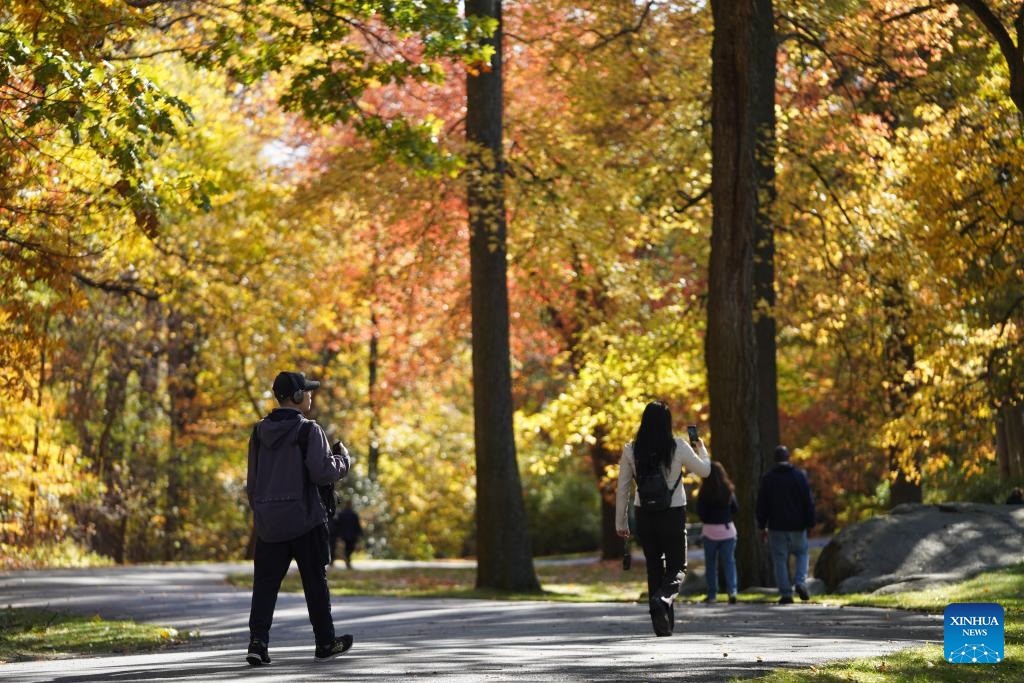 People walk in a forest at the New York Botanical Garden in New York, the United States, on Nov. 2, 2025.