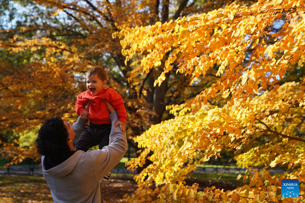 A man holds a boy up at the New York Botanical Garden in New York, the United States, on Nov. 2, 2025.