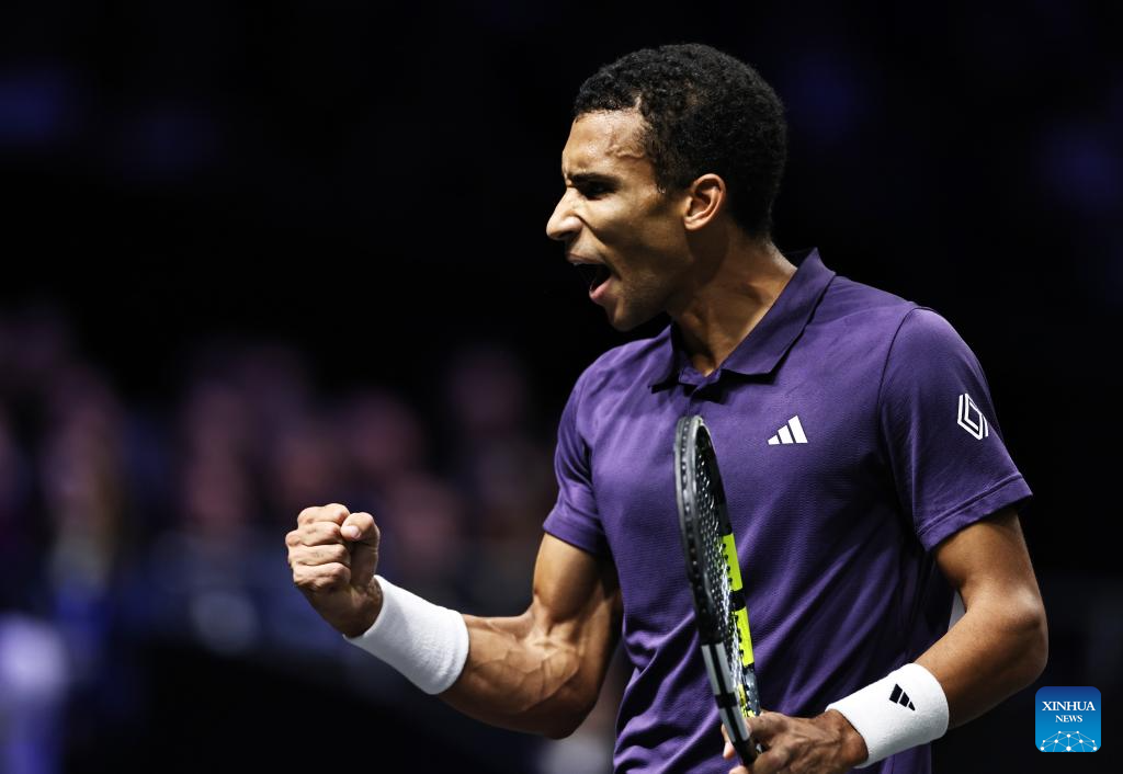 Felix Auger-Aliassime reacts during the final match between Jannik Sinner of Italy and Felix Auger-Aliassime of Canada at the Paris ATP Masters 1000 tennis tournament at Paris La Defense Arena in Paris, France, on Nov. 2, 2025. (Xinhua/Gao Jing)