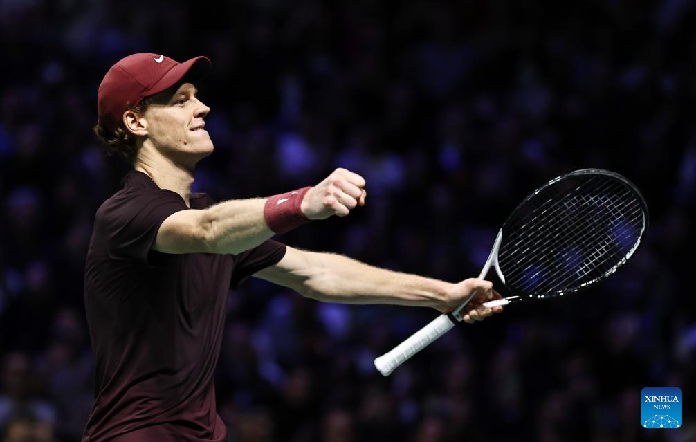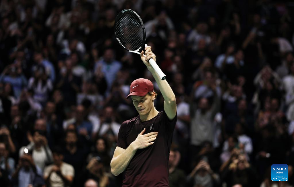 Jannik Sinner celebrates his victory after the final match between Jannik Sinner of Italy and Felix Auger-Aliassime of Canada at the Paris ATP Masters 1000 tennis tournament at Paris La Defense Arena in Paris, France, on Nov. 2, 2025. (Xinhua/Gao Jing)