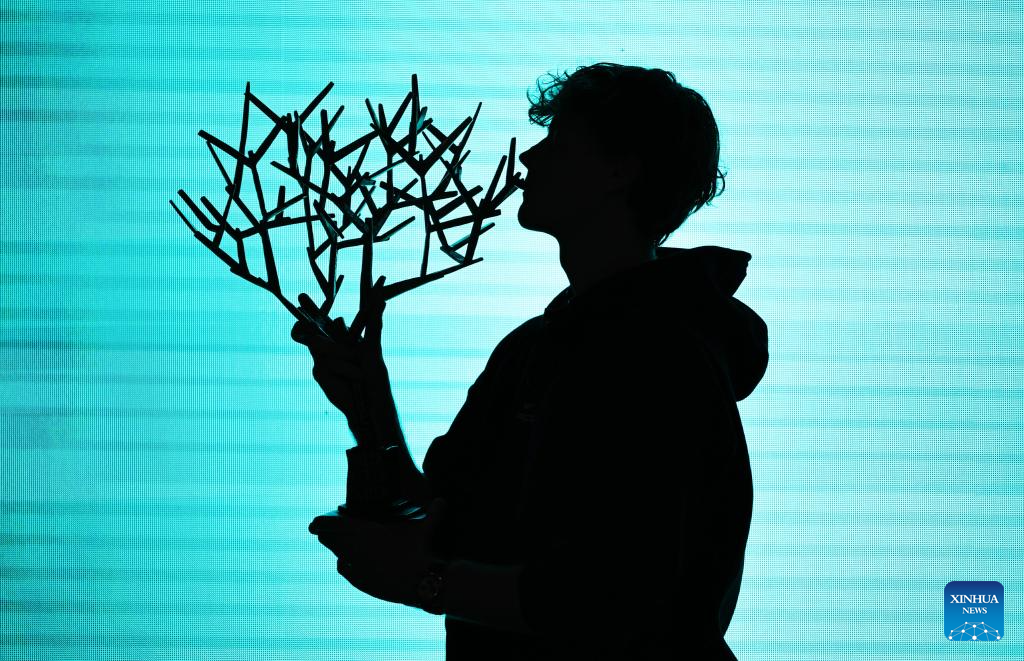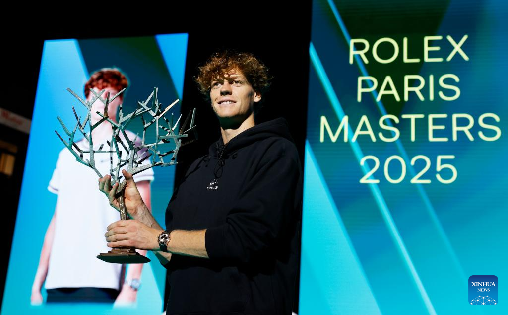Jannik Sinner pose with the trophy for photos during the reward presenting ceremony after the final match between Jannik Sinner of Italy and Felix Auger-Aliassime of Canada at the Paris ATP Masters 1000 tennis tournament at Paris La Defense Arena in Paris, France, on Nov. 2, 2025. (Xinhua/Gao Jing)