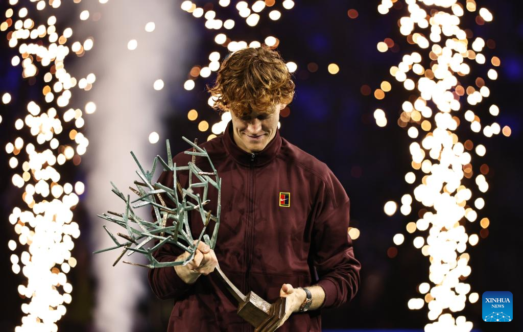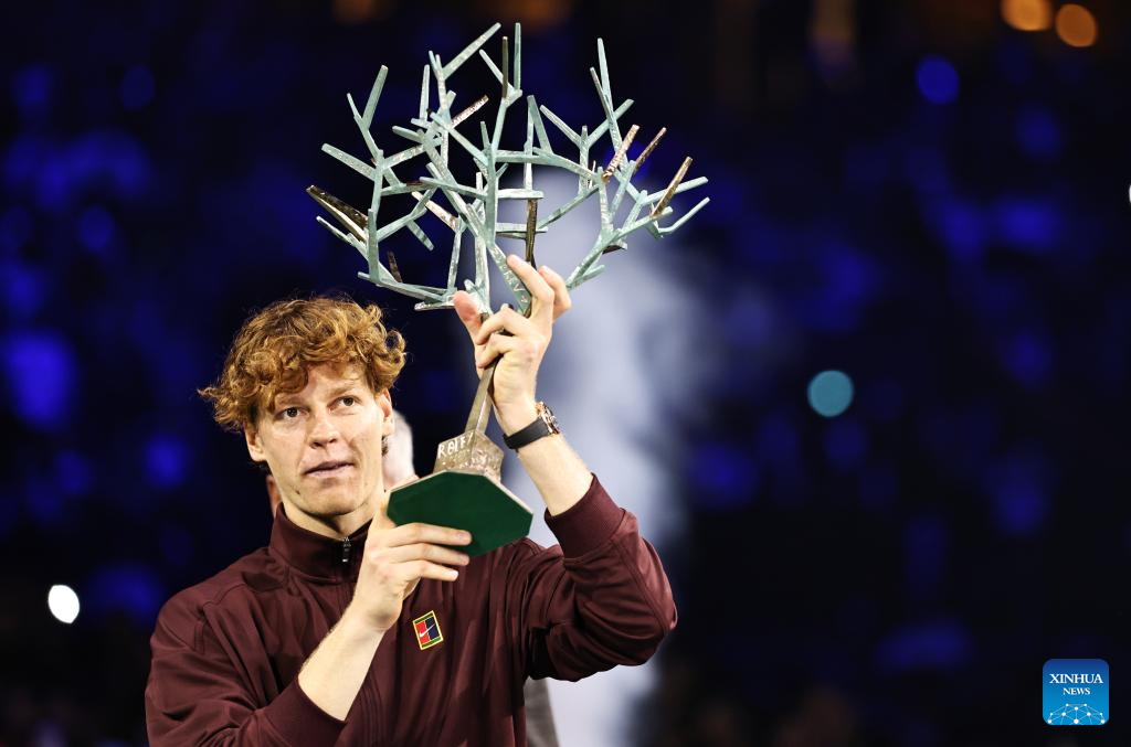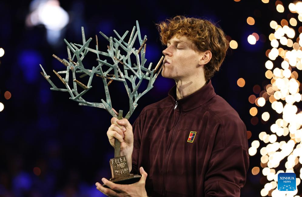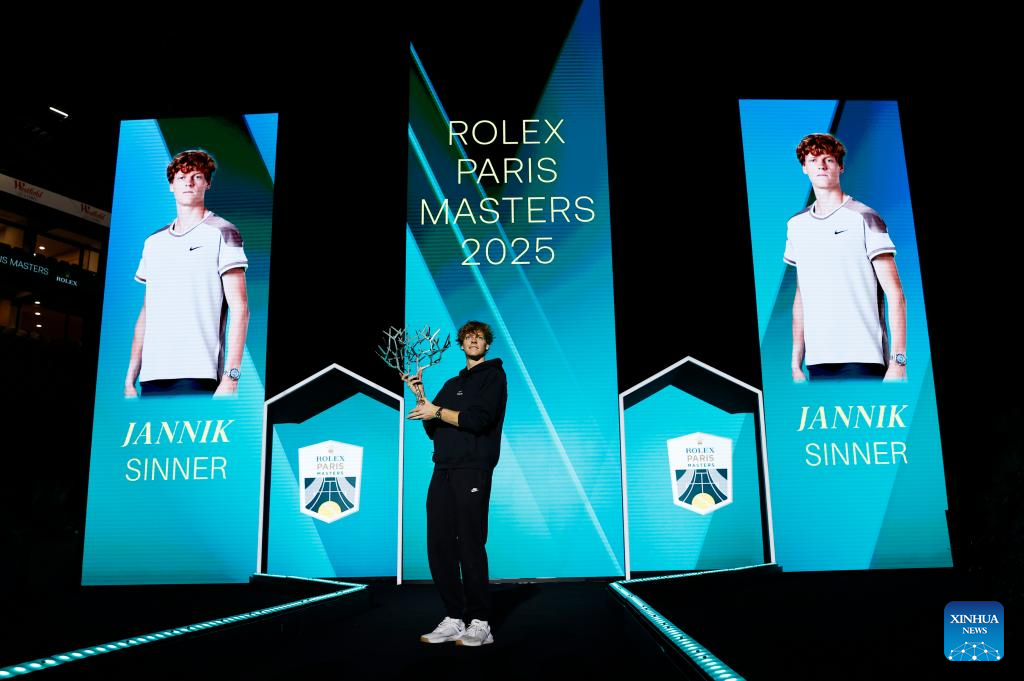 Jannik Sinner poses with the trophy after the final match between Jannik Sinner of Italy and Felix Auger-Aliassime of Canada at the Paris ATP Masters 1000 tennis tournament at Paris La Defense Arena in Paris, France, on Nov. 2, 2025. (Xinhua/Gao Jing)