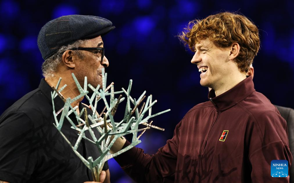 Former French tennis player Yannick Noah (L) poses with Jannik Sinner during the reward presenting ceremony after the final match between Jannik Sinner of Italy and Felix Auger-Aliassime of Canada at the Paris ATP Masters 1000 tennis tournament at Paris La Defense Arena in Paris, France, on Nov. 2, 2025. (Xinhua/Gao Jing)