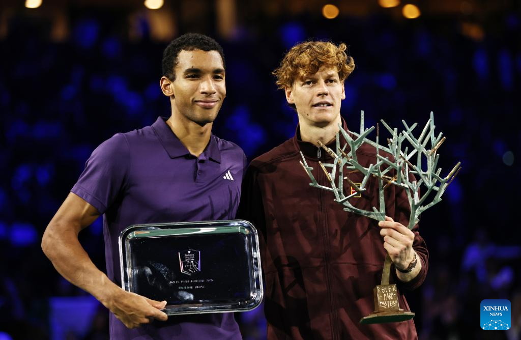 Jannik Sinner (R) and Felix Auger-Aliassime pose for photos during the reward presenting ceremony after the final match between Jannik Sinner of Italy and Felix Auger-Aliassime of Canada at the Paris ATP Masters 1000 tennis tournament at Paris La Defense Arena in Paris, France, on Nov. 2, 2025. (Xinhua/Gao Jing)