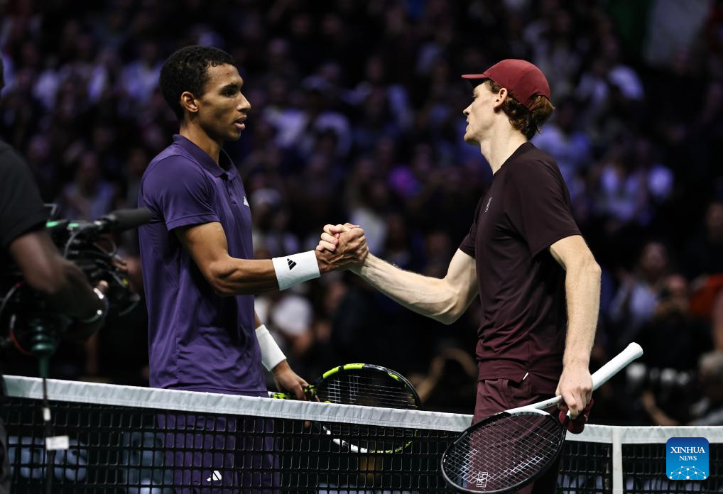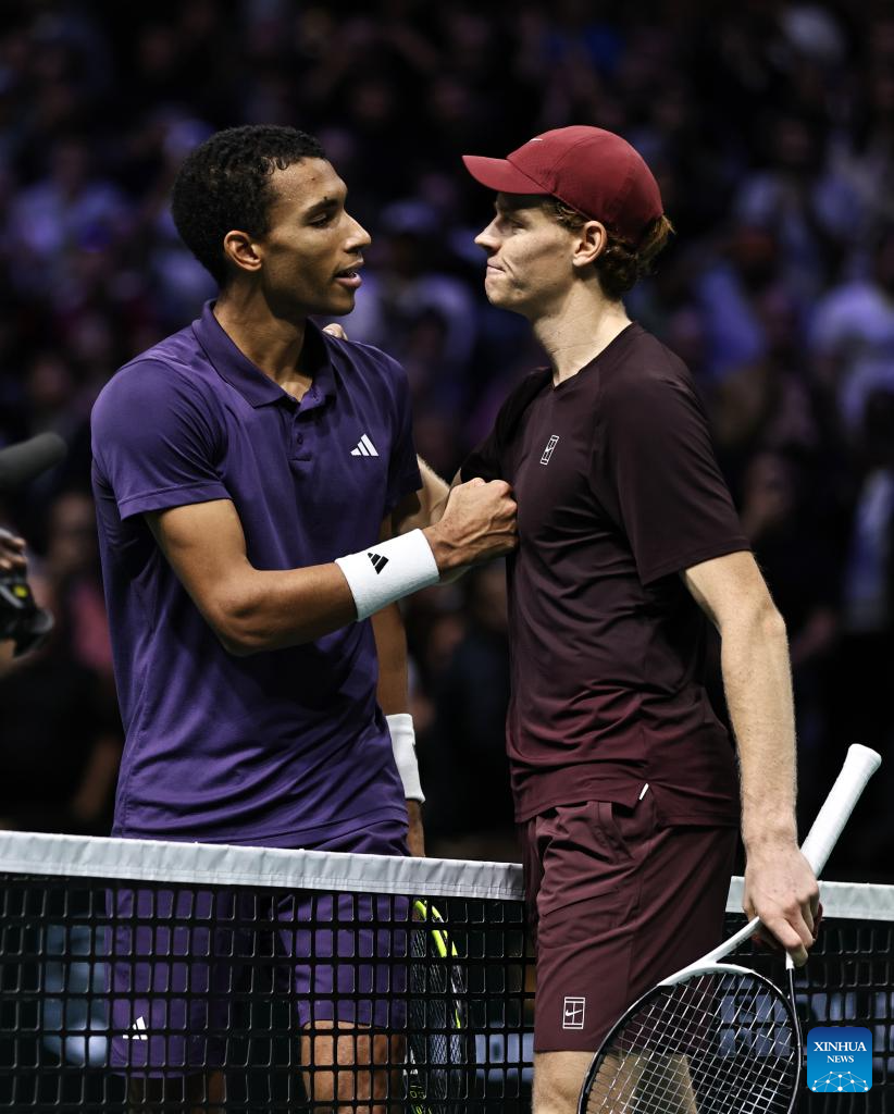 Jannik Sinner (R) of Italy greets Felix Auger-Aliassime of Canada after their final match the final match between Jannik Sinner of Italy and Felix Auger-Aliassime of Canada at the Paris ATP Masters 1000 tennis tournament at Paris La Defense Arena in Paris, France, on Nov. 2, 2025. (Xinhua/Gao Jing)