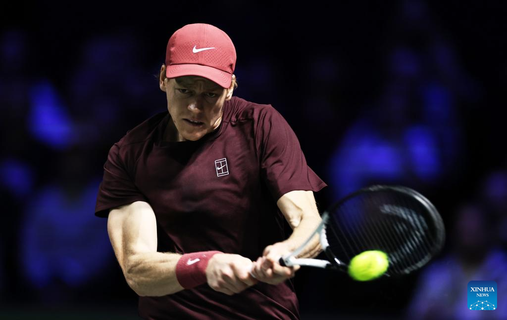 Jannik Sinner hits a return during the final match between Jannik Sinner of Italy and Felix Auger-Aliassime of Canada at the Paris ATP Masters 1000 tennis tournament at Paris La Defense Arena in Paris, France, on Nov. 2, 2025. (Xinhua/Gao Jing)
