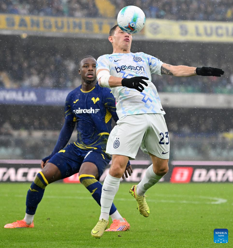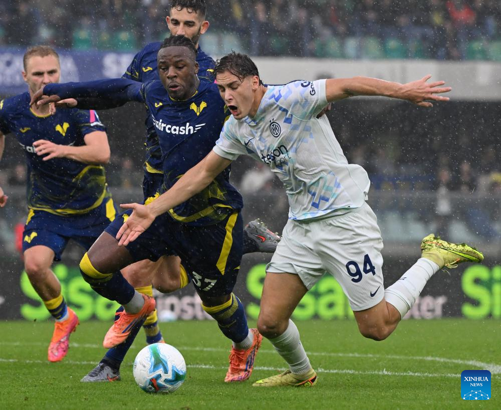 Inter Milan's Nicolo Barella (front) vies with Hellas Verona's Armel Bella-Kotchap during a Serie A football match between Hellas Verona and Inter Milan in Verona, Italy, on Nov.2, 2025. (Photo by Diego Petrussi/Xinhua)
