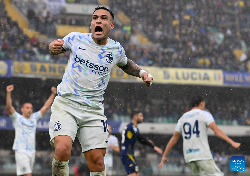 Inter Milan's Lautaro Martinez celebrates after the own goal of Hellas Verona's Martin Frese during a Serie A football match between Hellas Verona and Inter Milan in Verona, Italy, on Nov.2, 2025. (Photo by Diego Petrussi/Xinhua)