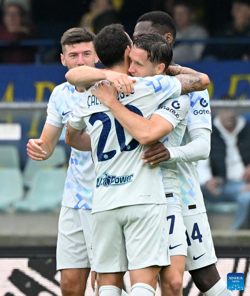 Inter Milan's Piotr Zielinski (2nd R) celebrates his goal with his teammates during a Serie A football match between Hellas Verona and Inter Milan in Verona, Italy, on Nov.2, 2025. (Photo by Diego Petrussi/Xinhua)