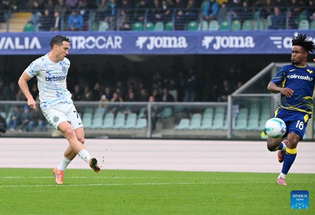Inter Milan's Piotr Zielinski (L) scores during a Serie A football match between Hellas Verona and Inter Milan in Verona, Italy, on Nov.2, 2025. (Photo by Diego Petrussi/Xinhua)