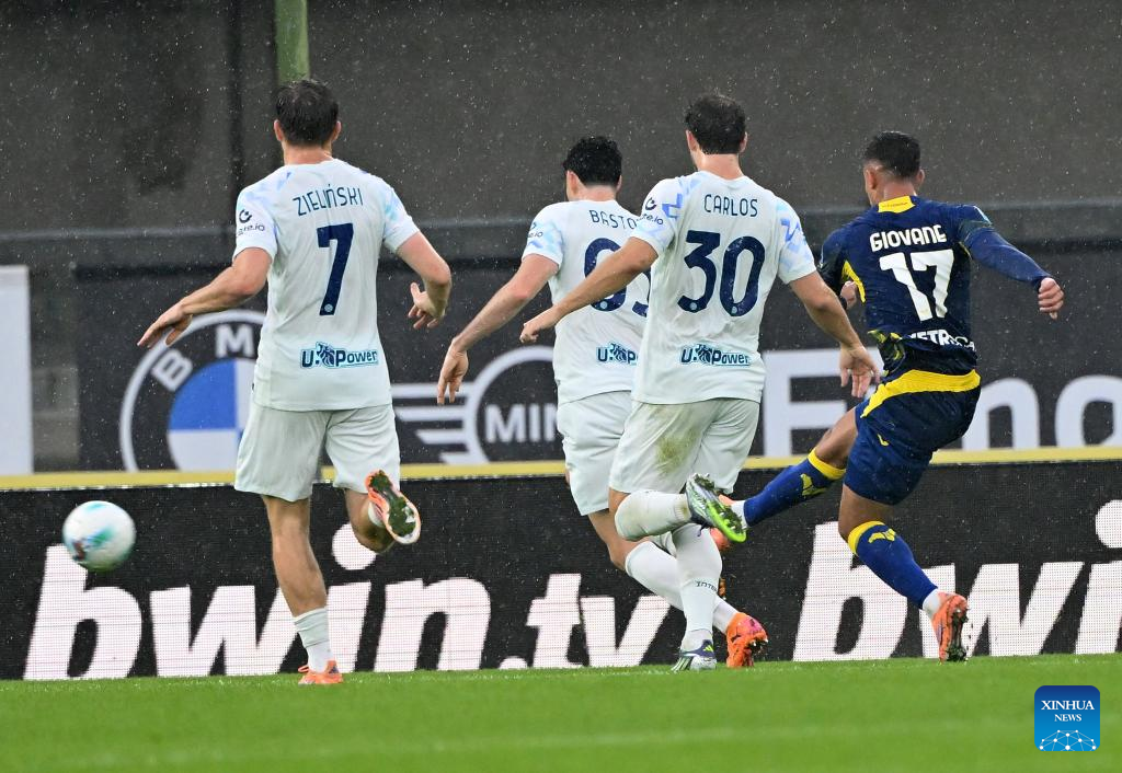 Hellas Verona's Giovane (R) scores during a Serie A football match between Hellas Verona and Inter Milan in Verona, Italy, on Nov.2, 2025. (Photo by Diego Petrussi/Xinhua)