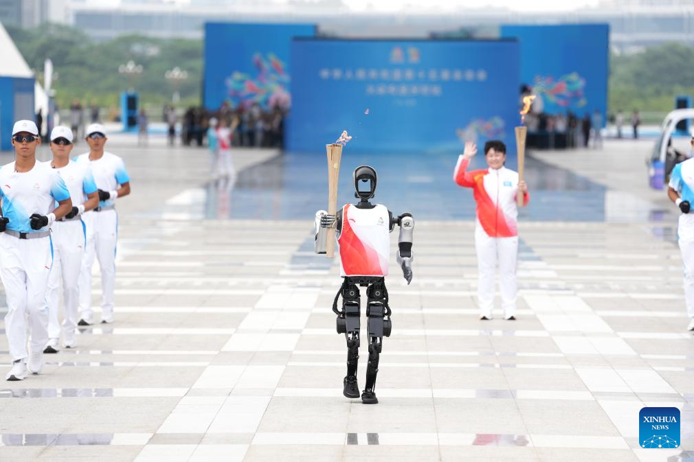 Torch bearer humanoid robot "Kuavo" (front) runs during the torch relay for China's 15th National Games in Shenzhen, south China's Guangdong Province, Nov. 2, 2025. (Xinhua/Jiang Han)