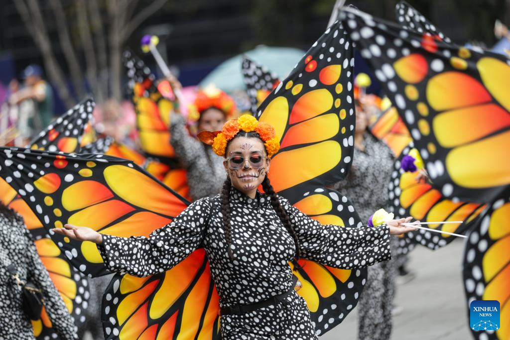 People in costumes and facial makeup participate in the Day of the Dead Parade in downtown Mexico City, capital of Mexico, Nov. 1, 2025. (Photo by Francisco Canedo/Xinhua)