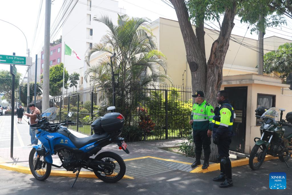 Peruvian police officers stand guard outside the Mexican Embassy in Lima, Peru, Nov. 4, 2025. The government of Peru has decided to break diplomatic relations with Mexico, Peruvian Foreign Minister Hugo de Zela told a press conference on Monday. (Photo by Mariana Bazo/Xinhua)