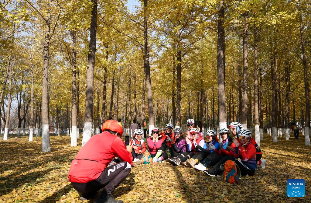 Cyclists pose for photos in a ginkgo forest at a forest park in Tianjin, north China, on Nov. 4, 2025. (Xinhua/Sun Fanyue)