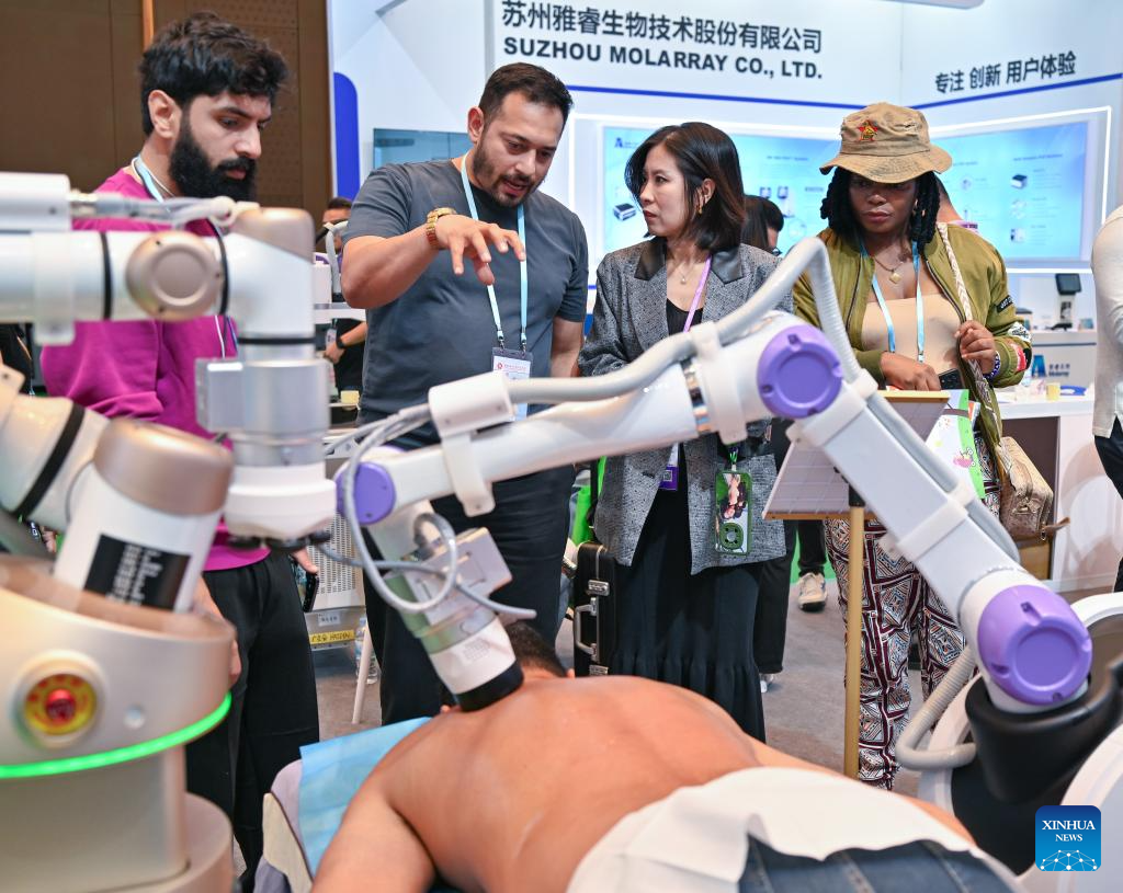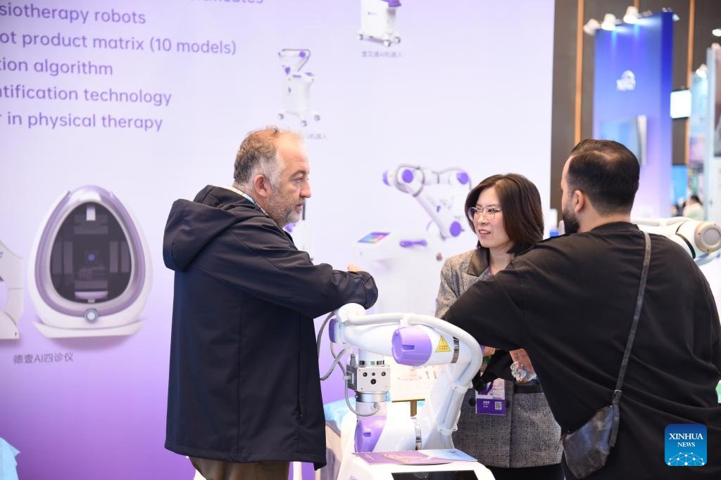 Buyers learn about a physical therapy robot during the 138th edition of the China Import and Export Fair in Guangzhou, south China's Guangdong Province, Nov. 3, 2025. The 138th Canton Fair, known officially as the China Import and Export Fair, came to a close on Tuesday in Guangzhou, the capital city of south China's Guangdong Province, having seen a record number of overseas buyers attend. (Xinhua/Xiao Ennan)