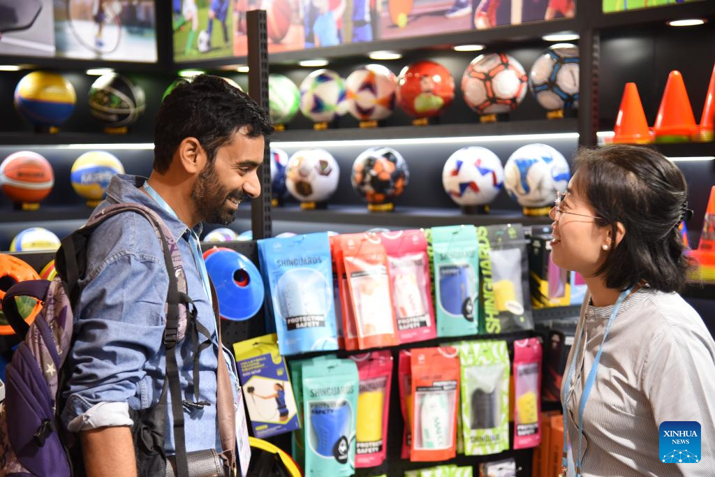 A buyer (R) learns about shoes during the 138th edition of the China Import and Export Fair in Guangzhou, south China's Guangdong Province, Nov. 4, 2025. The 138th Canton Fair, known officially as the China Import and Export Fair, came to a close on Tuesday in Guangzhou, the capital city of south China's Guangdong Province, having seen a record number of overseas buyers attend. (Xinhua/Hong Zehua)