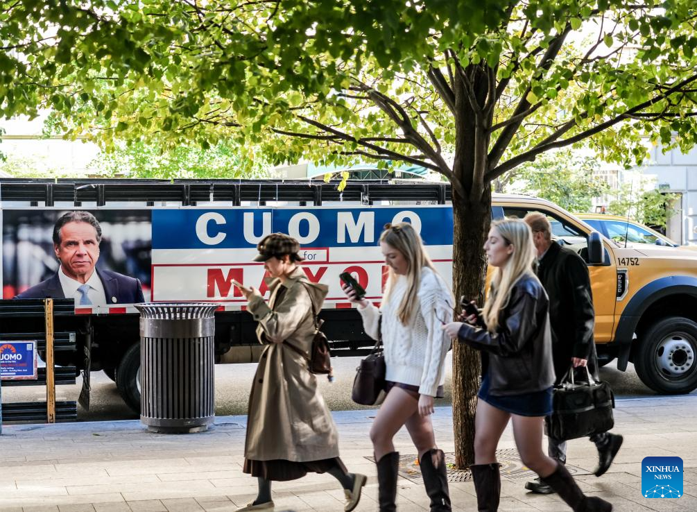 People walk past a campaign advertisement for former New York Governor Andrew Cuomo, running as an independent, during the New York City mayoral election in New York City, the United States, Nov. 4, 2025. Democratic candidate Zohran Mamdani won the New York City mayoral election Tuesday night, becoming the first muslim mayor of the most populous city in the United States. (Photo by Zack Zhang/Xinhua)