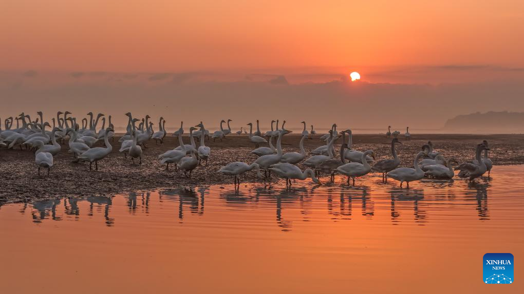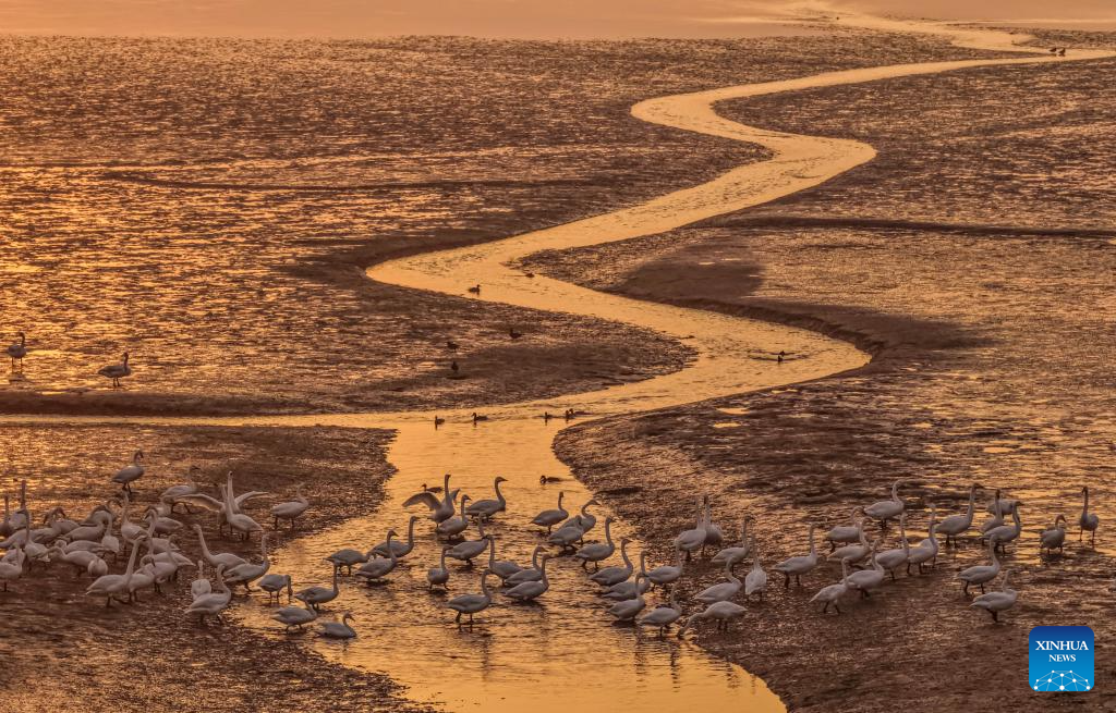 An aerial drone photo taken on Nov. 5, 2025 shows swans foraging at a nature reserve in Rongcheng City, east China's Shandong Province. (Photo by Li Xinjun/Xinhua)