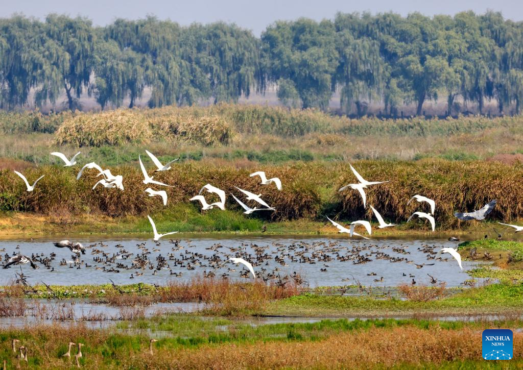 Birds fly over Fuhe river wetland in Wuhan, central China's Hubei Province, Nov. 5, 2025. (Photo by Zhao Jun/Xinhua)