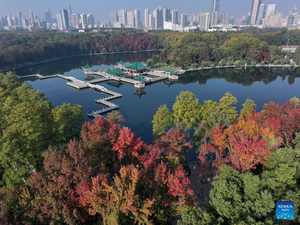 An aerial drone photo taken on Nov. 5, 2025 shows the autumn scenery of the Donghu Lake, in Wuhan, central China's Hubei Province. (Photo by Zhao Jun/Xinhua)