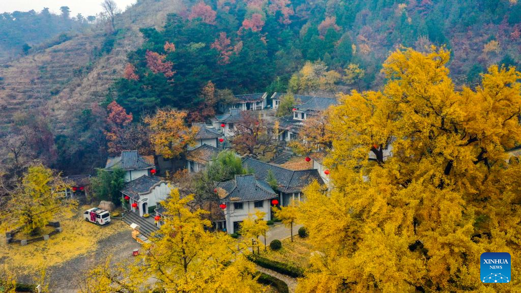 An aerial drone photo taken on Nov. 4, 2025 shows the autumn scenery of Zhujialing Village of Yi'nan County in Linyi City, east China's Shandong Province. (Photo by Wang Yanbing/Xinhua)