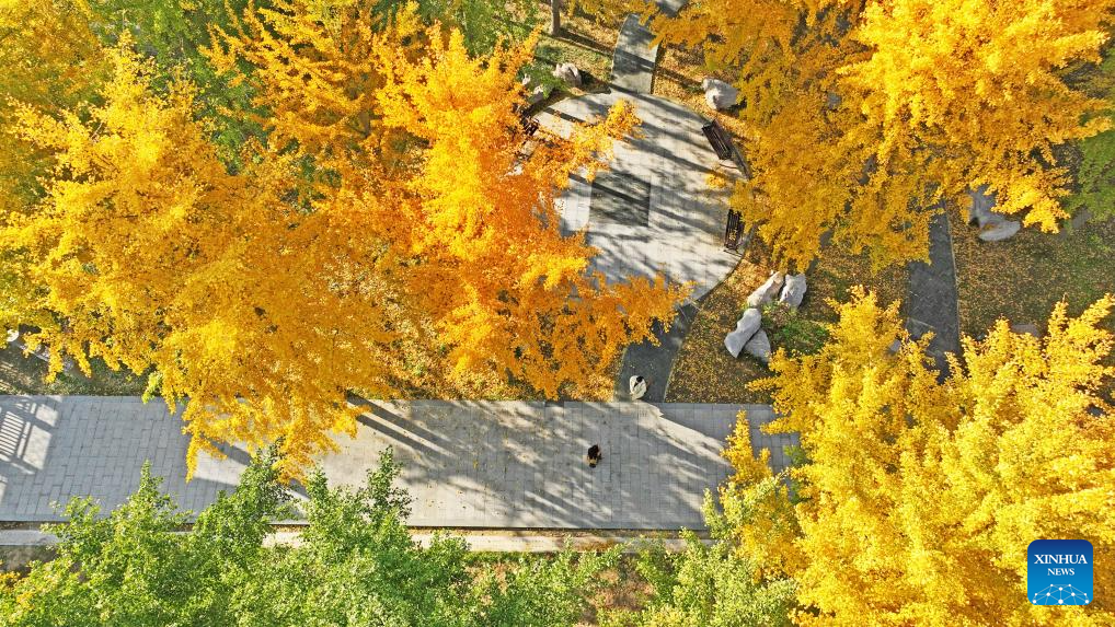 A drone photo taken on Nov. 3, 2025 shows people admiring ginkgo trees in Zouping City, east China's Shandong Province. (Photo by Dong Naide/Xinhua)