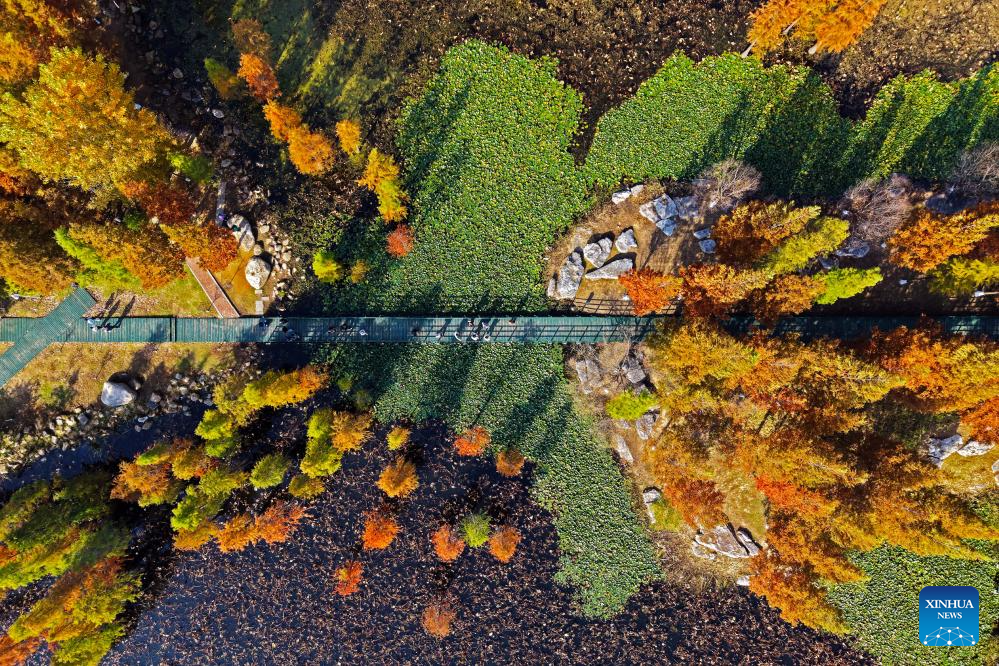 An aerial drone photo taken on Nov. 5, 2025 shows people visiting a wetland park in Yantai City, east China's Shandong Province. (Photo by Sun Wentan/Xinhua)